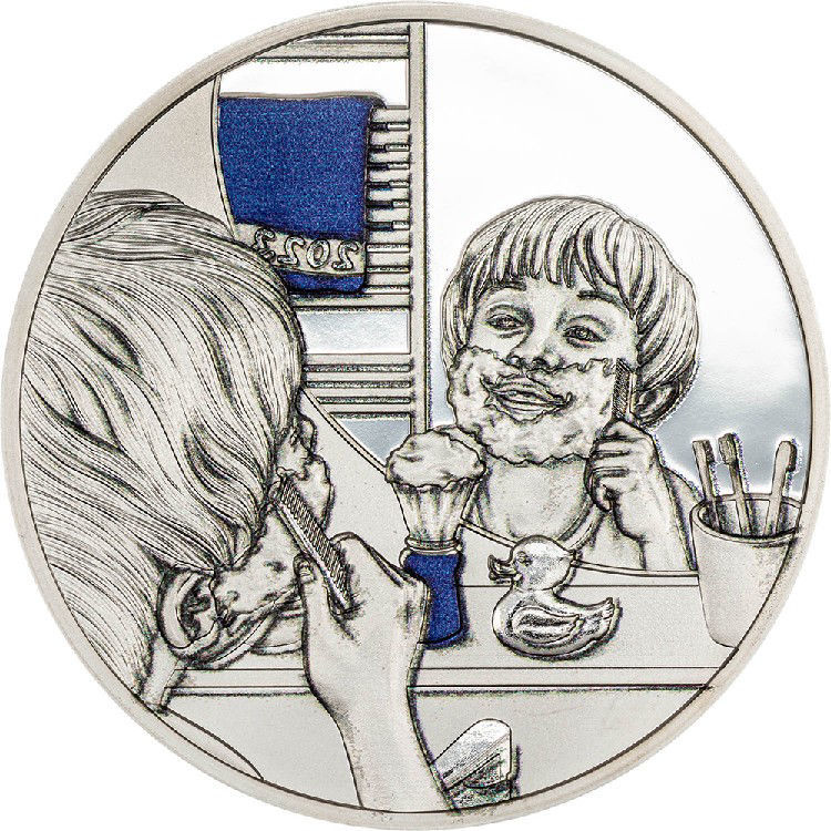 На реверсе представлена трогательная сцена: мальчик стоит перед зеркалом и, подражая отцу, «бреется», намыливая лицо. Детали интерьера и аксессуары подчёркивают бытовой, домашний характер сюжета. Отдельные элементы имеют цветовые акценты, что придаёт композиции эмоциональность и глубину.