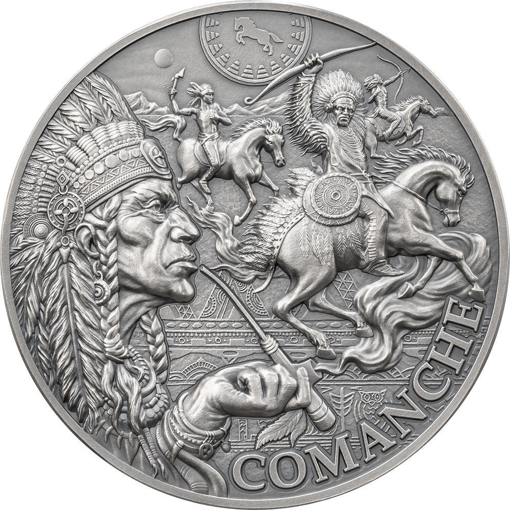 На аверсе монеты изображён портрет вождя команчей в традиционном головном уборе с перьями. На переднем плане он держит трубку мира, символизирующую духовность и традиции племени. На заднем плане представлена динамичная сцена всадников-воинов с луками на конях, передающая характерную мобильность и военное мастерство команчей. Внизу размещена надпись «COMANCHE». Рельеф отличается высокой детализацией, подчёркивающей текстуры одежды, оружия и конской упряжи.