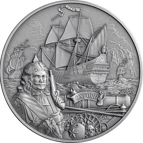 На аверсе монеты изображён портрет мореплавателя с подзорной трубой на фоне большого парусного корабля с развёрнутыми парусами. На заднем плане видны другие суда в море, что создаёт глубину композиции и передаёт масштаб морских экспедиций. В нижней части размещены декоративные морские элементы — канаты, раковины, кораллы и лента с надписью «OXFORD». Рельеф отличается высокой детализацией, подчёркивающей текстуру волн, деревянной обшивки корабля и одежды мореплавателя.