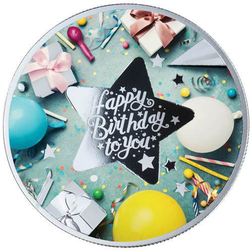На реверсе монеты представлена яркая праздничная композиция с подарками, шарами и конфетти. В центре размещена надпись «Happy Birthday to you!» на фоне звезды. Цветная печать усиливает эффект объёмности и создаёт атмосферу настоящего праздника.