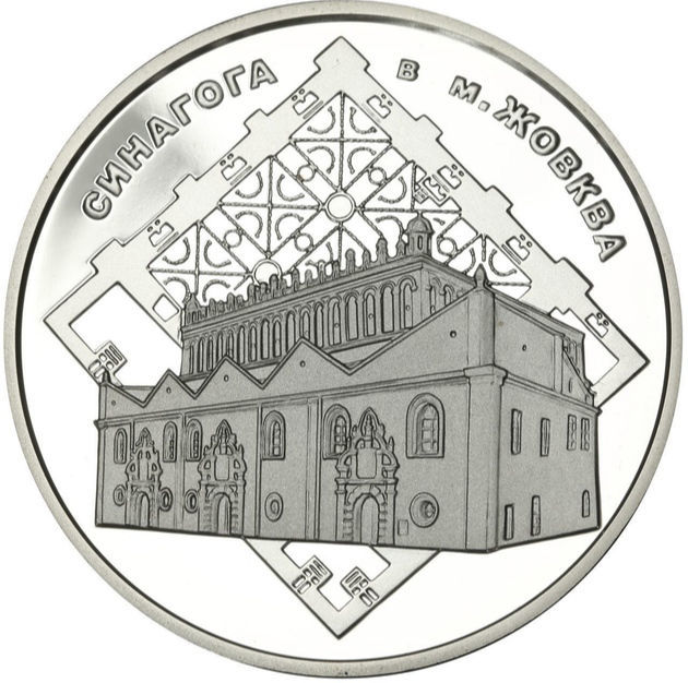 На реверсе монеты на фоне декоративно-условного плана здания изображена синагога, а вверху размещены надписи СИНАГОГА в м. ЖОВКВА.