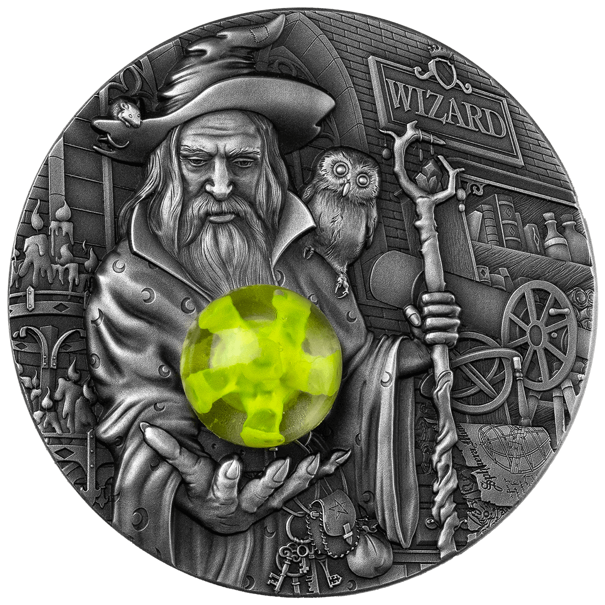 На аверсе монеты изображён мудрец с посохом. Рядом с ним — сова как символ знаний и проницательности. В центре композиции размещена вставка из яркого зелёного кристалла, имитирующего мистический артефакт или философский камень. Детализированный рельеф передаёт элементы старинной мастерской, алхимические инструменты и книжные полки, создавая глубину и объём сцены.
