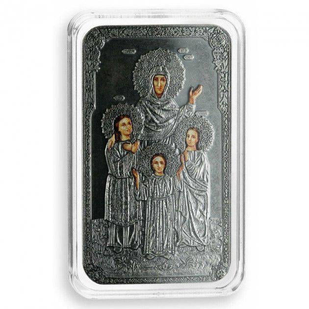 Реверс украшен рельефным изображением Святой Софии с тремя дочерьми — Верой, Надеждой и Любовью, символизирующими главные христианские добродетели. Детальная проработка образов и декоративная рамка придают изделию изысканность и духовный смысл. Такой дизайн делает слиток не только инвестиционным активом, но и оберегом, который станет ценным подарком.