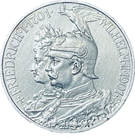 Аверс: профіль Фрідріха І і Вільгельма ІІ, а також надпис "FRIEDRICH.I.1701.WILHELM.II.1901.