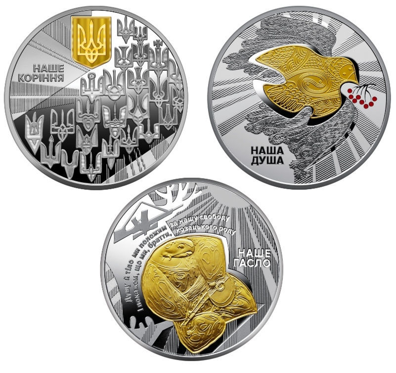 Набір із трьох срібних пам’ятних монет присвячений головним атрибутам української державності – гербу, прапору та гімну – як невід’ємним складовим національної ідентичності, глибоко вкоріненим у культурі, історії та ментальності українського народу. Тризуб як Знак Княжої Держави Володимира Великого уособлює історичну спадковість, духовну єдність та прагнення українців до свободи й самовизначення. Прапор, поєднуючи синій та жовтий кольори, знаменує добробут, природні багатства та процвітання України. Це кольори чистого неба і пшеничного лану, що були офіційно затверджені ще на прапорі Української Народної Республіки. Патріотична пісня “Ще не вмерла Україна” за півтора століття стала потужним символом боротьби за незалежність, що надихає наш народ на єдність та зміцнює почуття національної гордості.