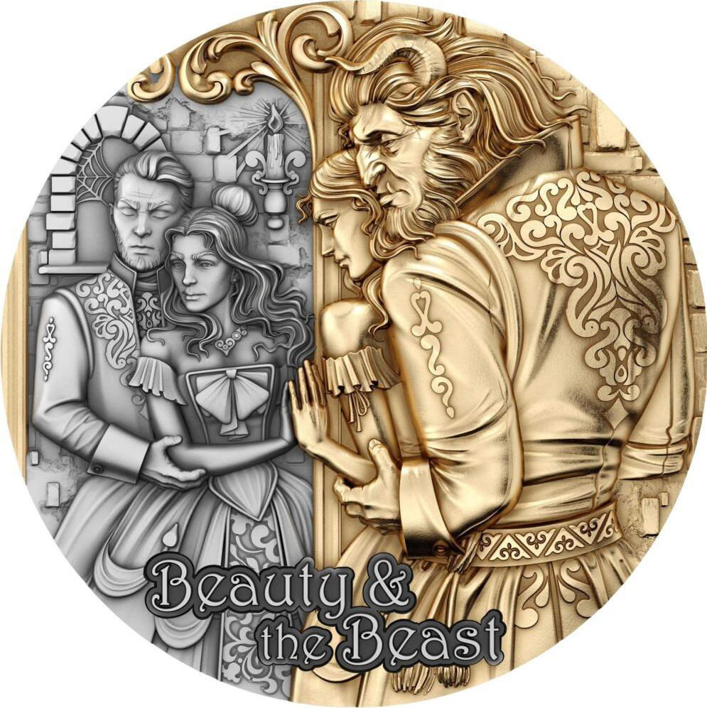 На реверсі зображено сцену з казки: Белль та Чудовисько стоять по різні боки дверей, що символізує межу між страхом і почуттям. Ліва частина виконана у сріблястих тонах, права — з позолоченим покриттям, що створює ефект переходу та перетворення. На задньому плані проглядаються архітектурні елементи замку. Внизу розміщено напис «Beauty & the Beast».