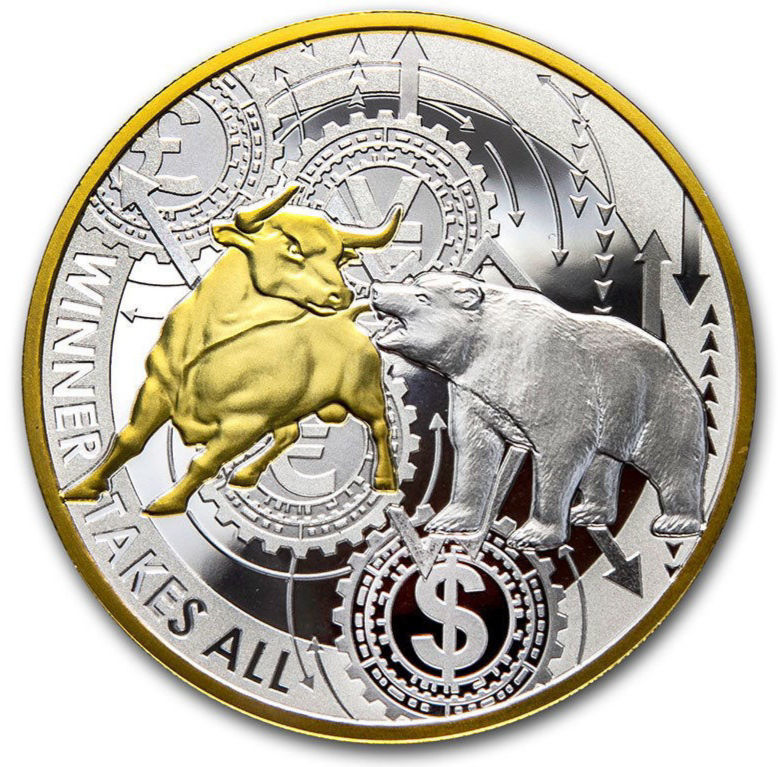 На реверсі зображено динамічну сцену — бика та ведмедя, які змагаються за першість на фінансовому полі бою. Бик, покритий золотим шаром, символізує зростання, оптимізм і силу, тоді як ведмідь у срібному блиску — спад, обережність і холодний розрахунок. На тлі — механічні шестерні й стрілки, що нагадують рух ринку, а внизу — знак долара. Ліворуч викарбувано напис: «WINNER TAKES ALL» — «Переможець отримує все».