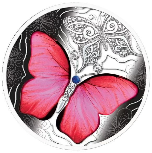 Реверс прикрашає великий кольоровий метелик із яскравими рожевими крилами, що привертає увагу завдяки реалістичності та глибині кольору. Фон доповнений декоративними елементами у вигляді орнаментів та ще одного стилізованого метелика, що створює гармонійну композицію та підкреслює художню цінність монети.