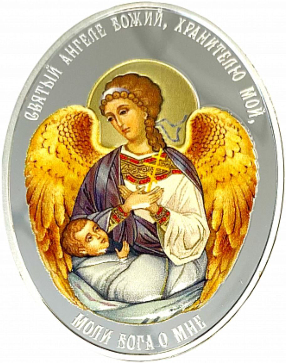 На аверсі раунда розміщено кольорове зображення ангела-охоронця, який оберігає дитину. Навколо композиції розташовано напис церковнослов’янською мовою: «Святый ангеле Божий, хранителю мой, моли Бога о мне». Деталізований рельєф і поєднання кольорового друку зі срібною поверхнею створюють глибокий художній ефект.